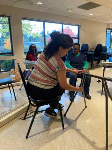 Susan working on an invisible pocket. Zori getting her tilt stand setup, being helped by Sarah and Mia.